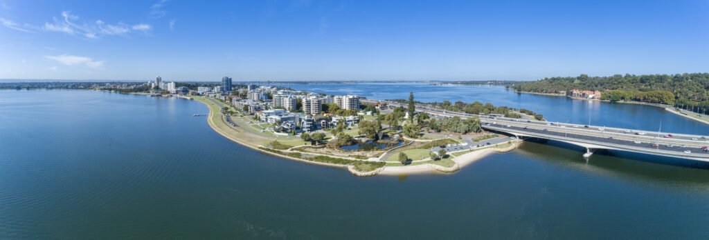 Aerial view of the South Perth Foreshore including part of the Narrows Bridge.