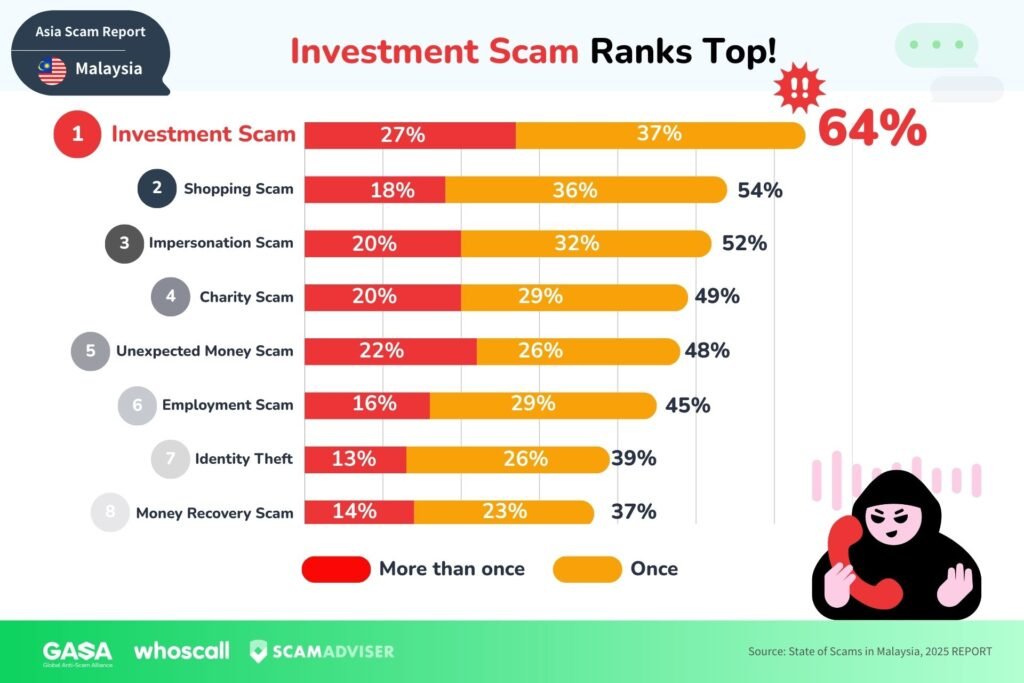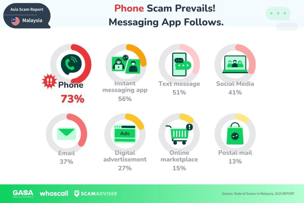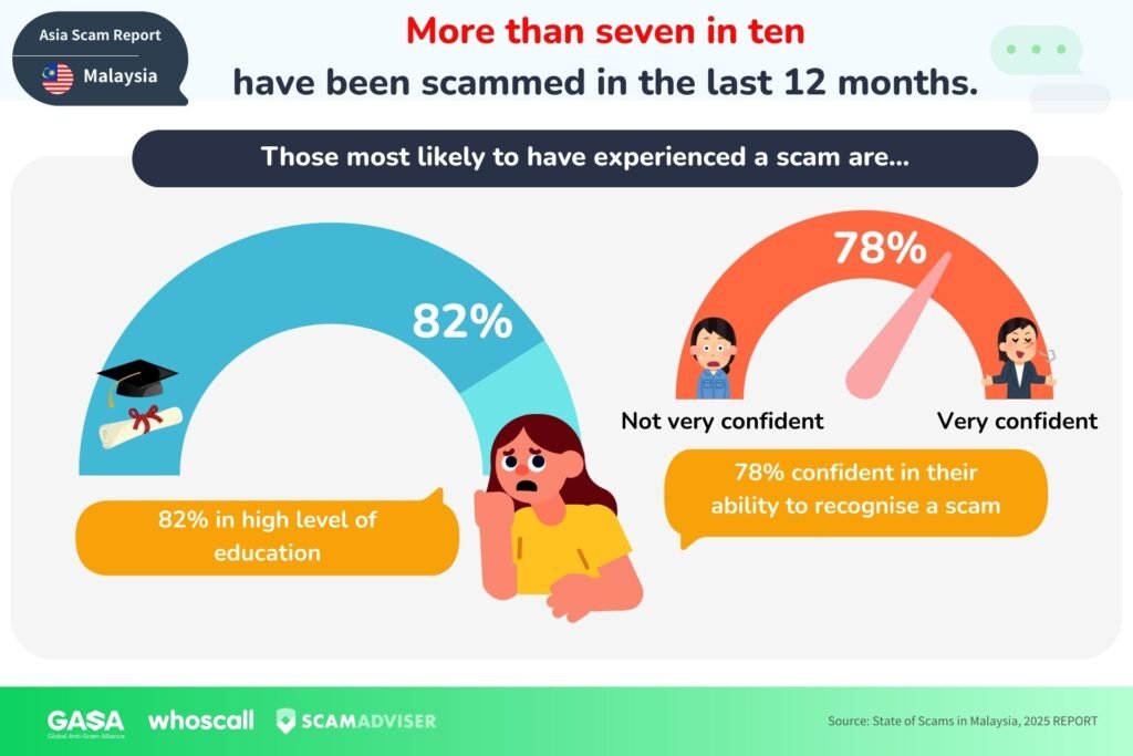 According to the 2025 State of Scams in Malaysia report by Gogolook and the Global Anti-Scam Alliance (GASA), 85% of Malaysians encountered a scam in the past year, and almost three-quarters ended up scammed, even though most felt confident they could avoid it.