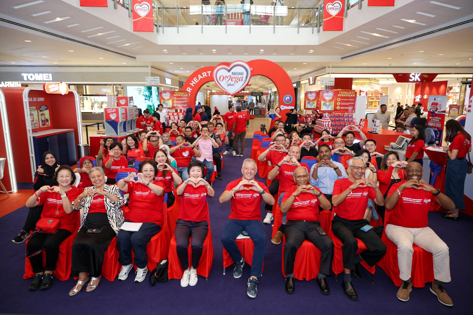 Distinguished guests, including Juan Aranols, CEO of Nestlé Malaysia performing the symbolic heartbeat rhythm at the Nestlé Omega Plus “Walk a Million Miles” 2025 kick-off launch.
